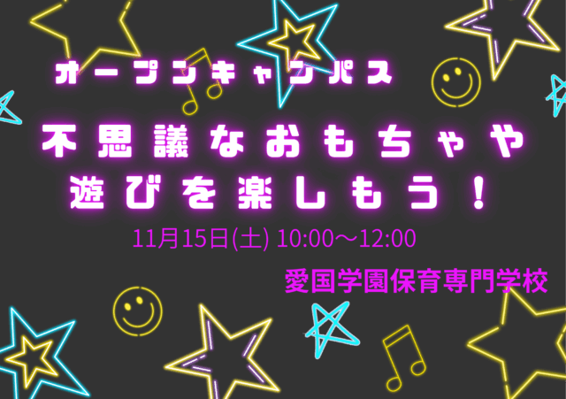 11月15日オープンキャンパス開催のお知らせ イベント 2025.10.20 🎲🕹️🧸オープンキャンパス情報🎲🕹️🧸 オープンキャンパスを開催いたします。 11月15日(土曜日)10:00~12:00 ご参加おまちしています! ご予約はこちら « BACK