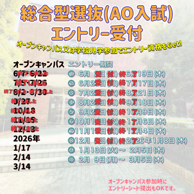 総合型選抜(AO入試)エントリーが1月13日(月)~2月5日(木)と